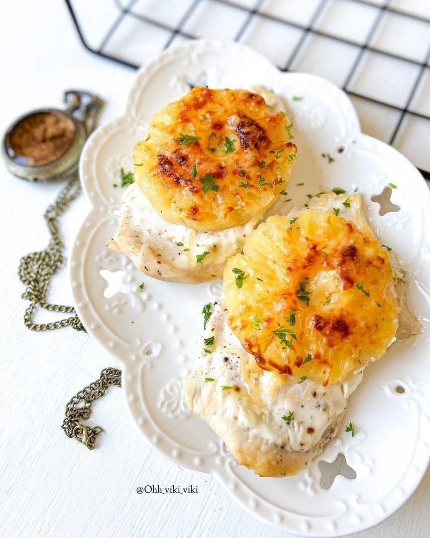КБЖУ в 1 шт 178/25/4,5/7,4 ⠀ Ингредиенты на 6 порций: Приготовление: Куриное филе надо нарезать на порционные кусочки по грамм 100. Ещё, если не лень, хорошо бы отбить филе. Кладём их в форму для запекания, приправляем. Кто хочет остренько, можно ещё капнуть соус табаско Смазываем сметаной. Кладём кольца ананаса, а сверху тёртый сыр. Запекаем минут 20-25 при 180 гр. Приятного аппетита!