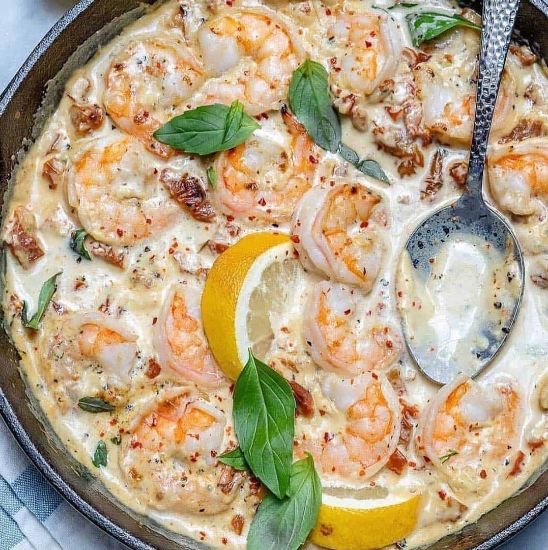 Ингредиенты: Приготовление: Растопить масло на сковороде, обжарить на нём чеснок в течение 30 секунд. Добавить сливки и перемешать. Добавить лимонную цедру, итальянскую приправу, красный перец, вяленые томаты, уменьшить огонь и готовить 3-4 минуты. Добавить креветки и готовить ещё 4-5 минут. Снять сковороду с огня, добавить базилик, соль и перец, перемешать. Готово Приятного аппетита!