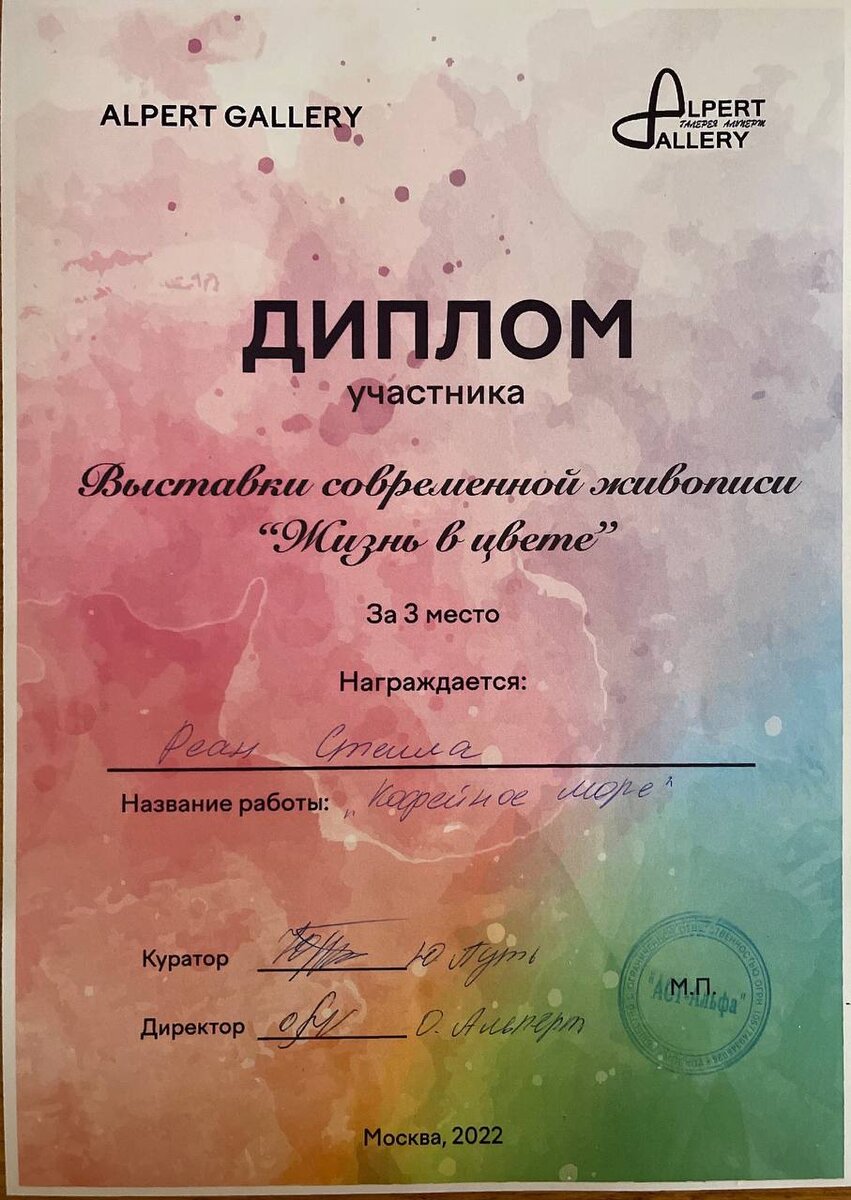 Пока отхожу от эмоций, делюсь с вами своей наградой! 3 место в конкурсе «Лучшая картина» 🥳 Для меня очень приятно получать такие награды, ведь это знак, что мое творчество действительно нравится зрителю. Получила невероятные эмоции от этой выставки и, конечно же, смогла насладиться творчеством коллег. Уже завтра поделюсь кадрами из галереи, которые уверена, вам очень понравятся 😌 #художник #картины #творчество #искусство #картинынахолсте #картиныназаказ #мыслихудожника #москватворчество #картинывдохновляют #картинынахолсте