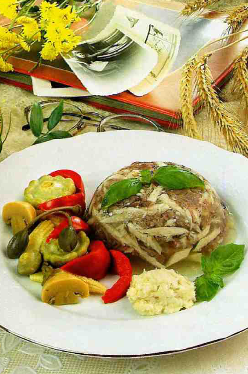 Для нашего блюда понадобятся ингредиенты: Начинаем готовить наш вкусный холодец: Обработанный говяжий сустав разрубить, залить холодной водой (2 л на 1 кг. продукта) и варить при слабом кипении 6 - 8 часов, периодически снимая жир и пену. Через 3-4 часа положить говядину и курицу и варить до готовности. За 30 мин. до окончания варки в бульон добавить овощи, лавровый лист и перец горошком. Сваренное мясо, курицу, сустав вынуть из бульона (у курицы удалить кости, у сустава сухожилия), мелко нарезать или пропустить через мясорубку. В процеженный бульон положить и мельченные мясные продукты, соль (20 - 22 г. на 1 кг. холодца), варить 10-20 мин. В конце варки добавить растертый чеснок. Холодец разлить в лотки или формы и охладить до застывания. Подать с соусом и консервированными овощами Следует отметить, что у русского народа всегда пользовались популярностью блюда из субпродуктов: печени, почек, рубцов, свиных голов и ножек, сальников и т. д. Ни один пир в старину не обходился бе