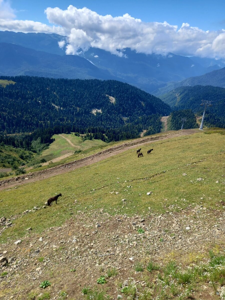 Привет, продолжаю рассказывать про мои пути-дороги на Розе Пик. Иду по маршруту, дышу полной грудью и наслаждаюсь красотами. Иду одна, только лошадки да коровки на склонах пасутся, да наверху кто-то на лошади проскакал. Обстановка волнующая, но было некоторое неудобство: выходит солнце, жарко, раздеваешься, нашли облака, моментально холодно и приходится опять одеваться, но дождя не было, это счастье. И вот, канатка Крокус, которая везёт только наверх. Чудное местечко, да? И только тут я задумалась, а включена она в мой билет или нет, ведь, как я сказала, на самый верх кассир могла истолковать как последнюю станцию, Роза Пик. Я слегка разнервничалась, но подумала, что если нет, то развернусь и пойду назад, таков и был запасной вариант. Но всё равно, вытащила билет, подставила под сканер и, да, билет включал канатку Крокус, я прошла и мне навстречу вышел мужчина, который сразу стал указывать, что мне делать. Но сначала фотография того, на чем сидишь на когда едешь на этой канатк