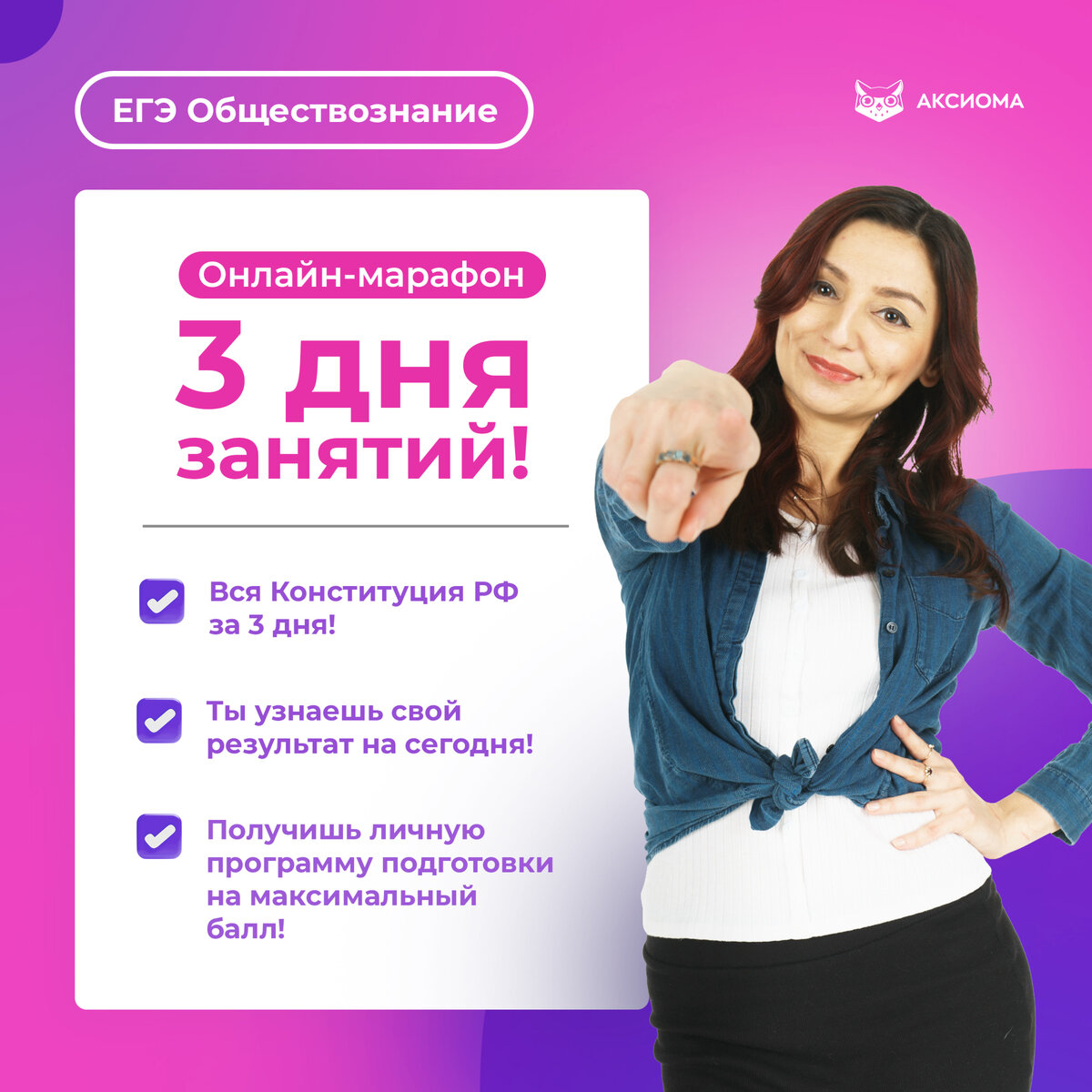 21, 22, 23 сентября я, Дина Замалеева, провожу Онлайн-Марафон по всей Конституции РФ ! - мы сможем с помощью лайфхаков и логики запомнить скучный текст Конституции РФ - научимся быстро решать задание 12 и 13 (1 часть) - разберём задание 23 (2 часть), чтобы суметь выполнить его на максимальный балл 1 день - структура Конституции РФ, изучаем главы 1-3 2 день - изучаем главы 4-7 3 день - применяем все на практике, учимся справляться с заданиями 2 части по Конституции РФ Изучи один раз КАЧЕСТВЕННО, чтобы не возвращаться вновь к пройденному - Сдала ЕГЭ по обществознанию на 100 баллов, и тебя подготовлю! - Средний балл учеников 80+ - Объясняю самые сложные темы самым простым языком до полного понимания учениками Участие в марафоне бесплатное! Мы стартуем в среду, 21 сентября, в 15.30 МСК. Присоединяйся! Подготовься на отлично и поступи в ВУЗ! Переходи по ссылке https://vk.cc/cgqFOV и будет тебе счастье! А ещё! Записываясь ко мне на годовой курс, ты получишь шпаргалки по Конституц