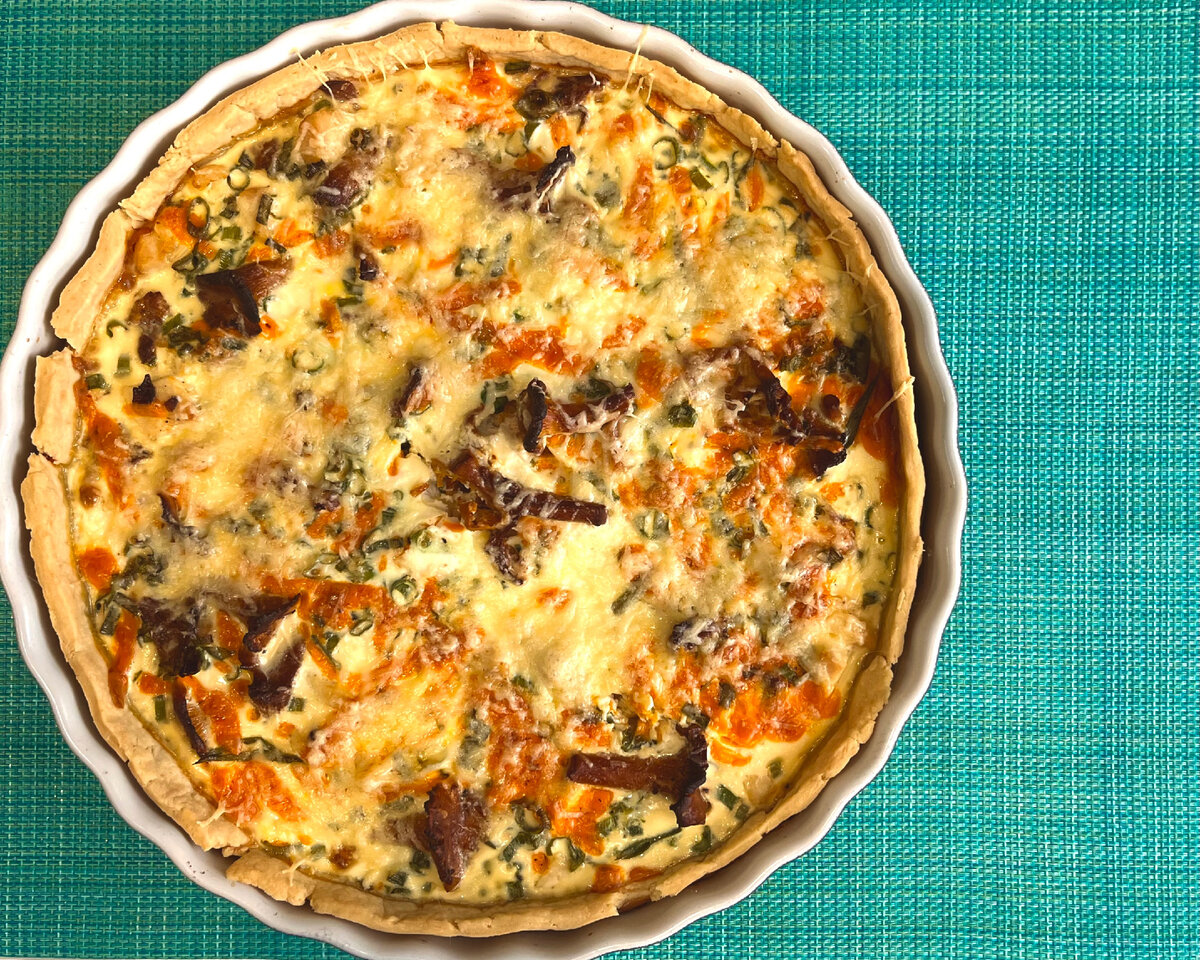 Вообще-то я собиралась сделать киш только с лисицами и луком, но поскольку в холодильнике была запечённая курица, ее я тоже зашарашила туда же. Но вообще и без куры будет заебись. Печем корж и делаем заливку так, как в этом рецепте. А начинка вот: 🍄 лисицы 300 гр 🌿 зеленый лук 100 гр 🍗 жареная, варёная или запечённая кура 🧂 соль, перец В хорошо разогретую сковородку высыпаем всех лисиц, предварительно промытых от говна и палок. Солим, перчим, ждём пока выпарится жижа и лисицы не начнут жариться, и жарим их минут 7-10 до румяненьковости. В готовый корж раскидываем некрупно порезанную курицу, грибасы, засыпаем нарезанным зелёным луком, льем заливку и ставим на 160-170 градусов выпекаться на час. Вуалябля!
