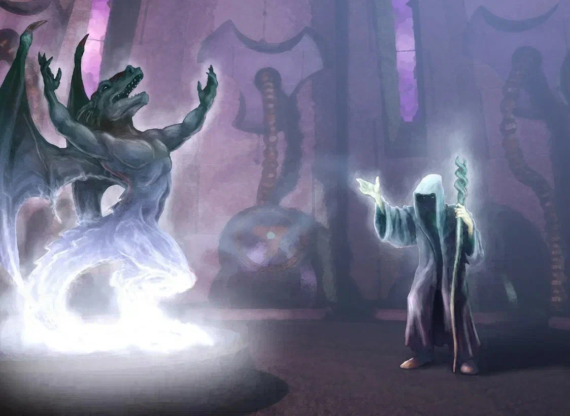 До Надалии добрались довольно быстро, но не стали приближаться сразу. Кадамасус велел приземлиться на расстоянии от города, после чего попросил Лану присмотреть за местностью, а сам с помощью психической проекции покинул тело и полетел в город. Зависнув над улицами, по которым бродила нежить, Кадамасус начал прощупывать город с помощью магии разума. Спектр восприятия оказался ограничен, но несмотря на это колдун все равно улавливал психические волны, исходящие от мертвецов. Десятки иссохших трупов, истерзанных жаждой, и среди этой толпы маг уловил сигнал более сильный, нежели обычно. Первое, на что подумал маг, — это еще один демон. Колдун принялся искать источник сигнала и быстро его нашел. Им оказался такой же мертвец, как и остальные. Высохший труп бродил по городской площади, нарезая круги вокруг полуразрушенной статуи, стоящей в центре небольшого фонтана. Фонтан был пуст, и на его дне можно было увидеть лишь пыль. Нежить, насколько видел маг, очень любила это место. Большая часть