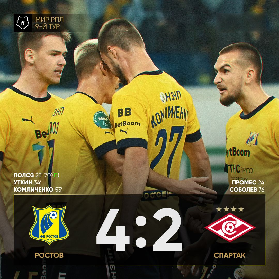 Испанский тренер так и не нашёл спасительного решения в кризисный период. После этого матча отпали все вопросы, почему те или иные игроки «Спартака» не играют, за исключением Николсона. После травмы ряда ключевых игроков поиграть успели все, но это дало далеко не положительный результат... Футбол был без центра поля... «Спартака». Ростовчане почти не напрягались в средней линии, выбирая порой самые изощрённые варианты из возможных, попутно получая подарки. Хвалёный недавно мною Денисов, например, далеко отпустил мяч при выходе из атаки, привезя голевую атаку на свои ворота во втором пропущенном, а Рыбус чуть не поперёк штрафной покатил мяч, находясь под прессингом. Мацей это вообще отдельный разговор. Три пропущенных мяча — чисто его вина, если не все 4. Как можно быть таким косячным — не понимаю. Неужели это всё дело случая и красная в дебютном матче так подкосила поляка? Ведь в «Локо» вроде играл уверенно, можно сказать вёл за собой команду. В сложившейся ситуации жаль лишь Соболев