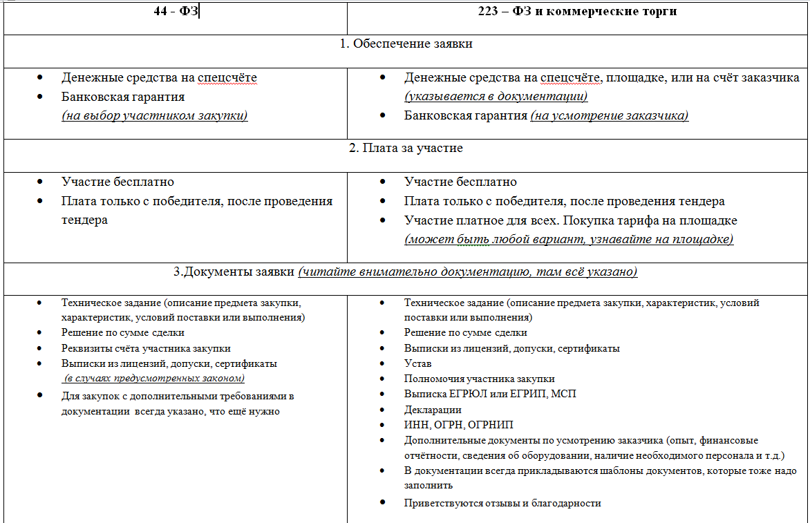 ВАЖНО. Внимательно прочтите документацию. Там прописаны все условия проведения. Посмотрите есть обеспечение заявки или нет. Для подачи заявки на коммерческие торги и тендеры по 223 - ФЗ может потребоваться дополнительная оплата участия. Подсказка для новичков: если сомневаетесь, обращайтесь с вопросами в техподдержку. На каждой площадке есть контакты. Найдите в документации список требуемых документов. Подготовьте всё по списку. Внесите обеспечение . Если необходимо оплатите тариф. Обеспечение заявки после участия в тендере вернётся назад. Тариф не возвращается. Загрузите заявку. Интуитивно на площадке понятно, что куда прикрепить. Есть подсказки. Если затрудняетесь, просто гуглите непонятные слова. Проверено. Это помогает. Отслеживайте сроки проведения тендера. Читайте итоговые протоколы. Так вы сможете понять какие ошибки допускаете. Исправить . Для следующих торгов пригодится. порядок действия при подачи заявки на тендер Сообщите, чем я могу быть вам полезна. Задавайте свои вопросы