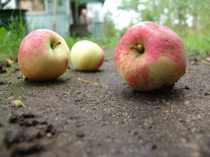 Сад мне достался старый и очень запущенный. Странное дело, но на сегодняшний день я почти не встречаю в деревенских садах хороших, сортовых яблонь и ягодных кустов. Растут у всех старые, корявые и чаще всего не привитые деревья. Но даже если встречается яблоня с хорошими плодами, то она обязательно заросшая, неухоженная, вся в лишайниках и грибках. На моём участке яблонь оказалось целых семь! Но плоды дают только три с половиной. Две яблони, скорее всего старинного осеннего сорта Коричное, и одна яблоня, отросшая ниже прививки кустом, но давшая съедобные маленькие яблочки. Летом нужно было наблюдать за деревьями, чтобы понять: можно ли их сохранить, и нужно ли это делать. Две относительно молодых яблоньки, на вид лет по 15, к сожалению, будут удалены, их стволы все в трещинах и поражены трутовиком, который превращает древесину в труху. Мне их очень жаль.