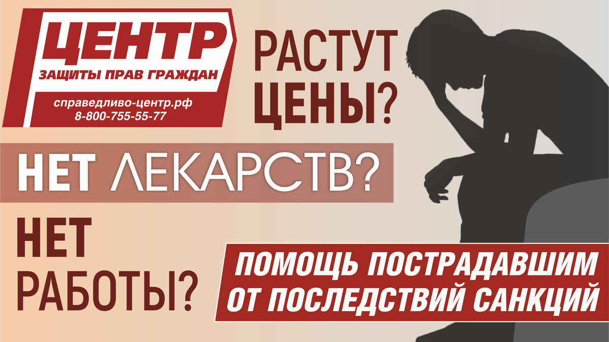НОВАЯ ПРОСВЕТИТЕЛЬСКАЯ ПРОГРАММА ЦЕНТРОВ ЗАЩИТЫ ПРАВ ГРАЖДАН В ПОМОЩЬ ЛЮДЯМ, СТОЛКНУВШИМСЯ С ПОСЛЕДСТВИЯМИ ЭКОНОМИЧЕСКИХ САНКЦИЙ ЗАПАДА На базе Центров оказывают бесплатную правовую помощь всем, кто оказался под риском увольнения, столкнулся с грабительскими ценами на прилавках, дефицитом жизненно важных лекарств или произволом чиновников, которые отказывают в мерах социальной поддержки. На этой странице собрана вся актуальная информация по изменениям в трудовом, налоговом, банковском и социальном законодательстве. Размещены алгоритмы защиты гражданских прав. Предоставлены образцы важных заявлений в органы власти. Здесь же можно отправить обращение специалистам Центра и получить онлайн-консультацию. Центры уже помогли тысячам граждан по всей стране. Все подробности на сайте справедливо-центр.рф. На сайте есть удобная форма обратной связи. Оставьте заявку - наши специалисты перезвонят и бесплатно проконсультируют.