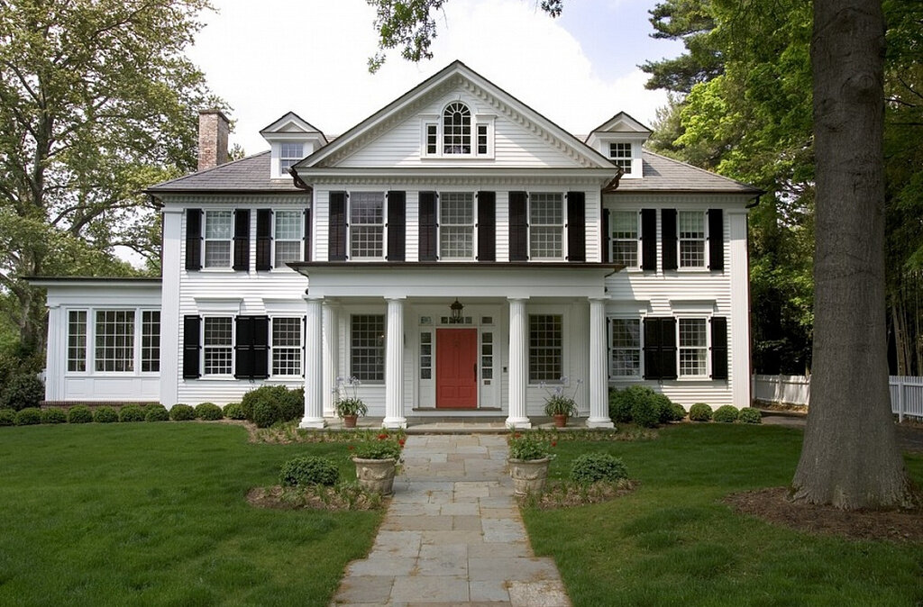 Для строительства непременно использовался кирпич. Входная дверь и окна выкрашивались в яркие цвета. Они и были единственным ярким украшением фасада. Другой декор (колонны, арки, пилястры, аркады) полностью отсутствовал. Крыша обязательно была скатной, иногда она обрамлялась фронтонами. Такой загородный дом в американском стиле идеально подходит тем, кому по душе умеренность и аккуратность форм. Здание имеет классический облик. Оно выглядит статно, но элегантно. В США сегодня таких вилл очень много. И все они принадлежат очень состоятельным людям.