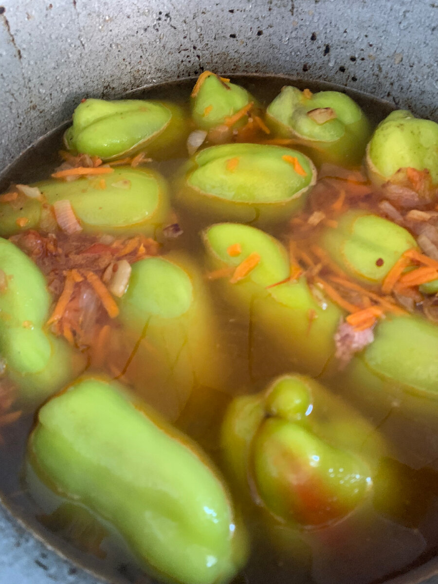 Перец мы заготавливаем заранее на зиму. Поэтому он у меня уже готовый. Я беру казан и выкладываю туда перец, у нас семья большая поэтому и перца много😁 Примерно штук 15 И затем к обжаренному луку добавляем натертую морковь 🥕 немного обжариваем и добавляем томатную пасту. Немного все тушим минут 5. К выложенным перцам добавляем по верх нашу заправку назовём ее так 🙂 Добавляем воды чтобы просто покрыли перец. Готовим до готовности. Солим перчим. Приправы по вкусу. Приятного аппетита !!!❤️❤️❤️