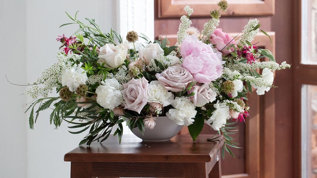 - Для помпезной классики подойдут букеты роз и пионов, а также зелень насыщенных, темных тонов;
