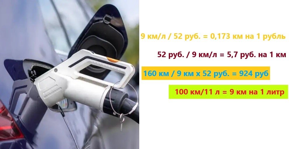 Если стоимость бензина АИ 95 в среднем 52 рубля за литр, то автомобиль, который проезжает 9 км на 1 л, даст результат 0,173 километра пробега на 1 российский рубль. Для сравнения: автомобиль, который проедет 11 км на 1 литре, даст результат 0,212 километра на 1 рубль.
