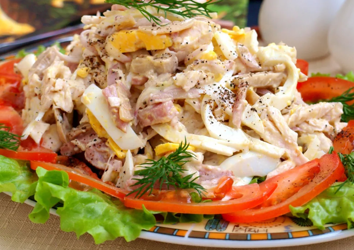 Подборка салатов Здравствуйте дорогие хозяюшки! Сегодня хочу с вами поделиться рецептами очень интересных салатов. Салат мясной с капустой и картофелем Нам понадобятся продукты: 250 г. отварной говядины, 2 клубня отварного картофеля, 150 г. капусты, 100 г. майонеза, 2 вареных яйца, 1 помидор, зелень укропа, листья салата, соль кладем по вкусу, Приготовление: Капусту нарезаем ножом на доске соломкой и прогреваем в горячей воде, затем охлаждаем. Говядину нарезаем полосками. Очищенные картофель и вареные яйца, нарезаем небольшими брусочками. Все ингредиенты соединяем в миске, перемешиваем и заливаем майонезом. Добавляем соль по вкусу. Готовый салат украшаем тонкими кольцами помидора,веточками укропа. Салат мясной с маслинами Нам понадобятся продукты: 80 г. ветчины, 80 г. отварной говядины, 3 клубня отварного картофеля, 50 г. консервированного горошка, 70 мл. растительного масла, 130 г. маслин, 80 г. майонеза, 1 вареное яйцо, зелень, перец, соль кладем по вкусу, Приготовление: Картофель