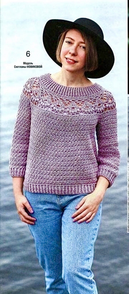 Очаровательный пуловер с круглой кокеткой. Вязание крючком.