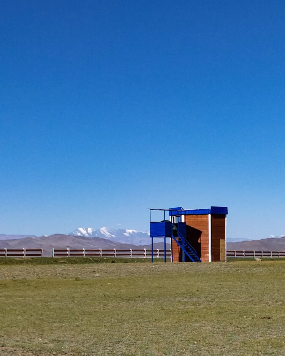 Я свернул с трассы в степь и брёл по бедной каменистой почве, всматриваясь в даль, в надежде найти местечко, которое подарит мне хоть толику уюта. Вдали виднелся забор и какая-то постройка. Приблизившись, я распознал в этом подобие ипподрома и двух судейских вышек, за забором стоял шест с флюгером в виде всадника, а вокруг копытами выбит на земле огромный овал маршрута для скачек. Одна вышка была крытой с разбитым окном, но запертая на замок. Вторая металлическая в виде веранды, высоко поднятой над землёй. Это моё спасение! 🙏 палатка и велик ровненько поместились на маленькой площади, а главное - я спал не на земле!!!