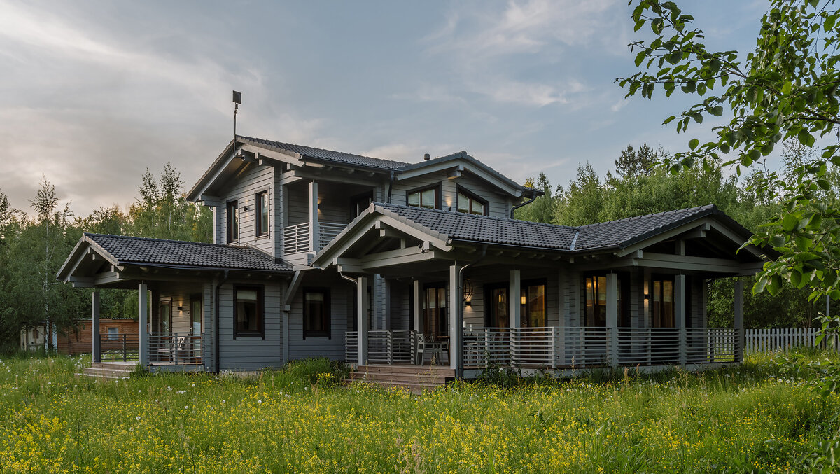 У владельцев этого дома большая семья — заказчиком выступал старший сын с супругой, у него есть два младших брата, сестра, мама с папой и бабушка. И одним из основных пожеланий было предусмотреть место всем членам семьи. Чтобы всем хватило места, семья приобрела два соседних участка в коттеджном поселке на берегу водохранилища с уже построенными домами из бруса.