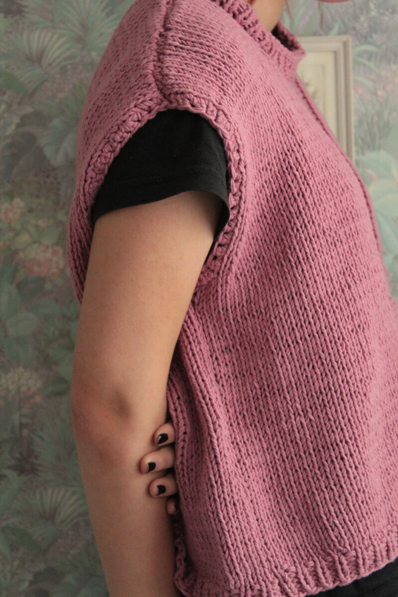 Все они связаны ещё год назад, как раз тогда, когда мой шкафчик стал ломиться от количества мотков разной пряжи и я запретила себе покупать новые нитки, пока не использую всё купленное. Первым я связала объёмный розовый жилет с сердечками. В составе 70% хлопка, 30% шерсти. Пряжа называется Alpina Misty, она мне очень нравится, хоть после стирки на ней и появляются катышки. Но если есть машинка для катышек, то это не проблема! Во всём остальном я очень довольна опытом вязания и носибельностью вещей - жилетов, кардиганов - из этой нити. Люди, для которых я вязала, тоже. Поэтому не удивительно, что в запасе у меня была также упаковка этой же пряжи, но в другом цвете - голубом. Из неё мне захотелось сделать что-то нежное и женственное. И я попробовала рюши. Другой - очень тёплый укороченный жилет - я связала из разных остатков Drops Andes. В составе 65% шерсть, 35% альпака. Изделия из этой пряжи, к сожалению, с машинной стиркой не дружат, но греют отлично! Жилет получился яркий, иде