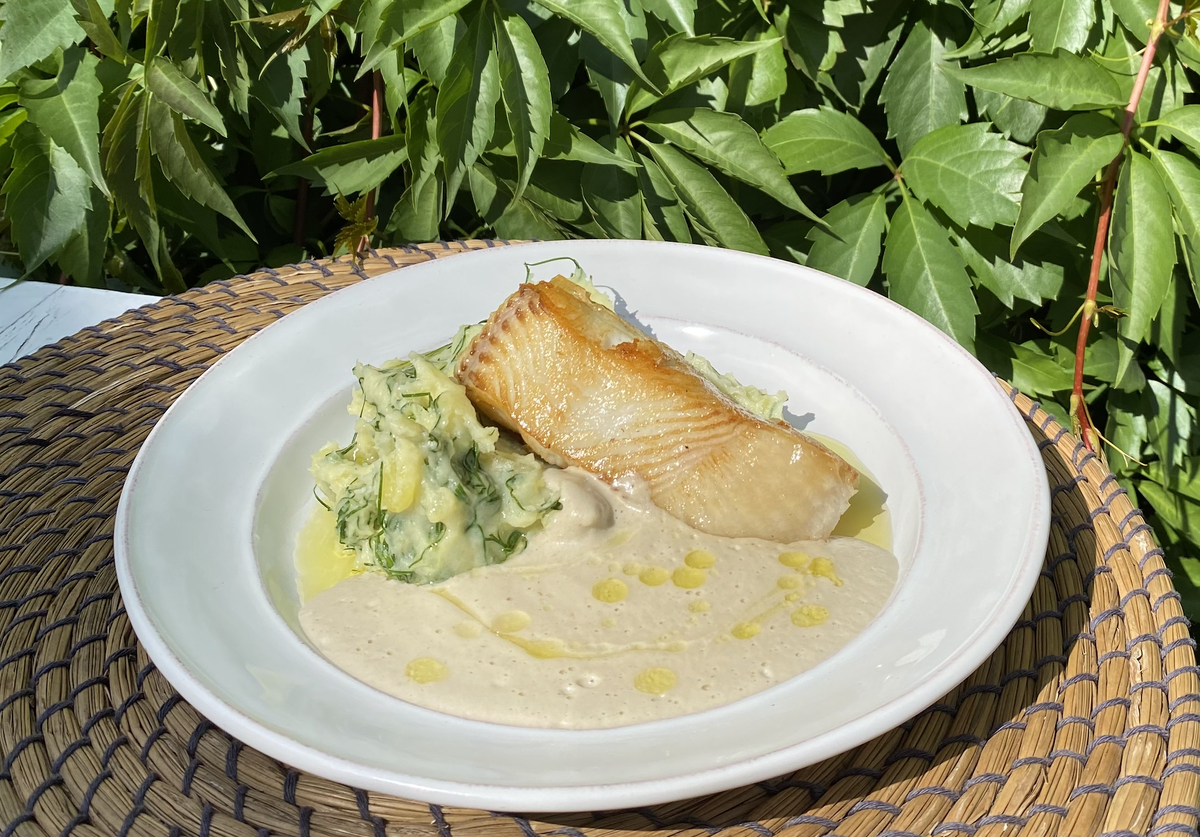 Стейк из палтуса с толченым картофелем и грибным соусом