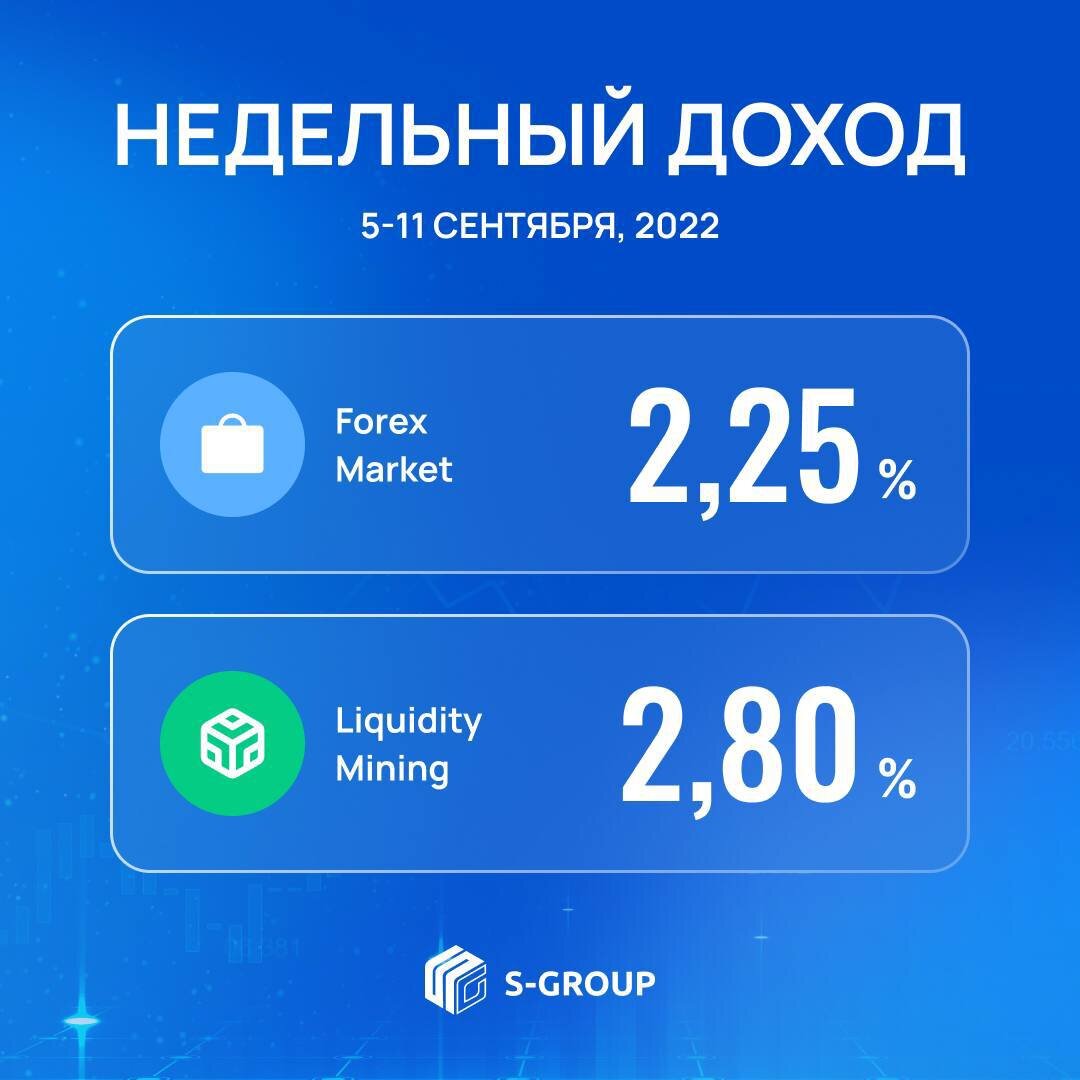 Недельный доход S-Group c 5 по 11 сентября🗓 💰 Прибыль публичного пула Forex Market составила +2.25%📈 💸 Прибыль в направлении Liquidity Mining SWP составила +2.80%📈 Наш телеграмм канал https://t.me/investforever РЕГИСТРАЦИЯ В КОМПАНИЮ ЧЕРЕЗ ВПН https://clck.ru/sRa3R