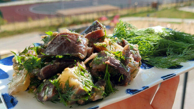 Как приготовить баклажаны быстро и вкусно? Предлагаем самый простой рецепт закуски из баклажанов, по вкусу они будут немного похожи на маринованные грибы. Вкусное блюдо из баклажанов с чесноком будет готово через 6-7 часов. Маринованные баклажаны Ингредиенты: - баклажаны 1 кг; - вода 1300 мл; - уксус 9% 4,5-5 ст. л.; - соль 2,5 ст. л. и сахар 1 ч.л. без горки; - укроп 50 г; - чеснок - половина головки; - подсолнечное масло 150 мл; Приготовление: 1. Ставим кипятиться воду, добавляем в нее уксус, соль и сахар. 2. Режем баклажаны на кусочки примерно 2×2 см. Если хотите, можно очистить от кожуры, но это не обязательно, она не будет твердой в финале. 3. В кипящую воду закиньте баклажаны, после закипания варите 5 минут, периодически помешивая. 4. Откиньте баклажаны на дуршлаг (не перемешивайте) и оставьте примерно на час, чтобы стекла вся вода и они остыли. 5. Переложите баклажаны в миску, добавьте мелко порубленный укроп, пропущенный через чеснокодавку чеснок и масло, хорошо перемешайте. 6.