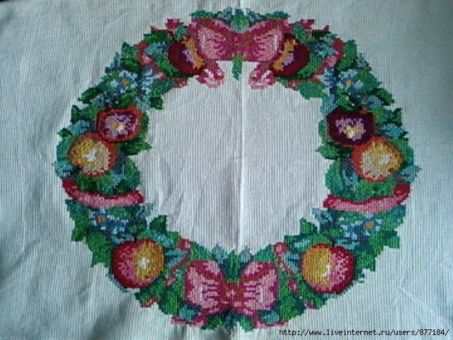 Несколько лет назад вышивала крестом вот такой фруктовый венец: Работа шла с перерывами и растянулась на продолжительное время. И когда я закончила вышивку, то испытала чувство радости о наконец-то выполненной работе. Журнал со схемой отдала коллеге по работе, назад мне его не вернули, вместо него дали другой журнал. Но схема вышивки осталась у меня в виде ксерокопии.