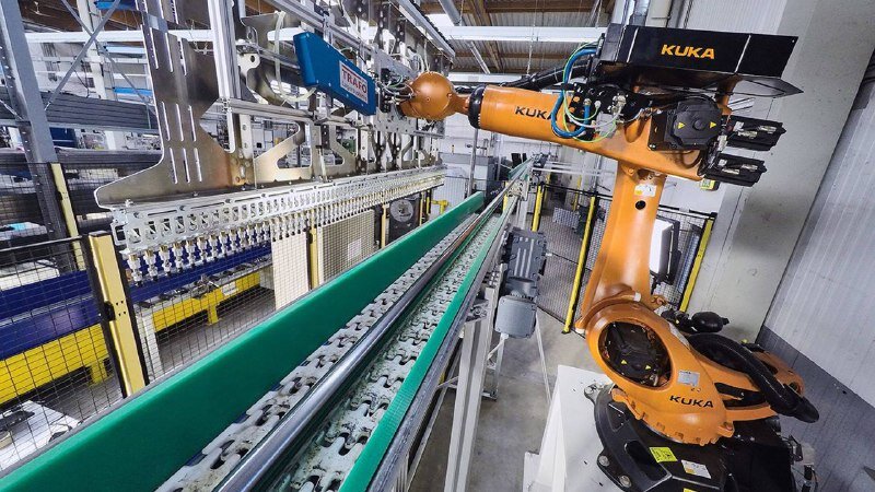 На производстве высококачественной офисной мебели компании Trafö робот KUKA QUANTEC выполняет связующую функцию: он полностью автоматически загружает трубки лазера в ячейку. Роботизированная ячейка значительно упрощает работу и ускоряет производственную последовательность. Теперь лазерную систему можно использовать в беспилотном многосменном режиме. Робот оснащён двумя вакуумными захватами для крупных и многоугольных труб. Он выбирает соответствующий инструмент и берёт нужную трубку. Благодаря автоматизированной загрузке лазера удалось значительно повысить экономическую эффективность производства. Более того, точная и автоматическая подача материала позволяет максимально эффективно использовать лазер. С помощью робота-комплектовщика лазерную систему можно обслуживать в несколько смен с продолжительностью цикла менее одной минуты. #KUKA #KUKARobotics #Robots #Robotics #Цифровизация #Роботы #Роботизация #Индустрия40 #SmartFactory #ПроизводствоБудущего