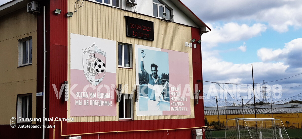 Стадион СШ№3, 17, микрорайон Давыдовский-3, г. Кострома. Освещение естественное, есть электронное табло, не использовалось. Одна центральная трибуна, оборудована пластиковыми креслами. Искусственный газон. Зрителей ~5 человек. Погода: переменная облачность, +12.