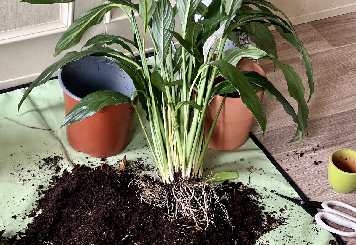 Если вы пересаживали молодое растение или растение только что купленное в магазине, то могли заметить, что корни начинают расти практичски сразу от розетки листьев. Совсем иначе обстоят дела со взрослым спатифиллумом. У него появляется "ствол", который может уходить как в грунт, так и расти над поверхностью. Если растение наращивает его внутри горшка, то от него просто начинают развиваться новые корни. А вот надземняя часть образуется за счет отсыхания старых листьев. Если убрать сухие чешуйки (остатки старых листьев), то можно увидеть зачатки воздушных корней. Если этот ствол вам не нравится, то при пересадке его можно заглубить в грунт до того места, где начинается пучок листьев. Со временем от него также начнут расти корешки. А если подземная часть стала слишком длинной, то ее можно подрезать с конца. Такой же "стволик" наращивает антуриум, только гораздо быстрее и выше.