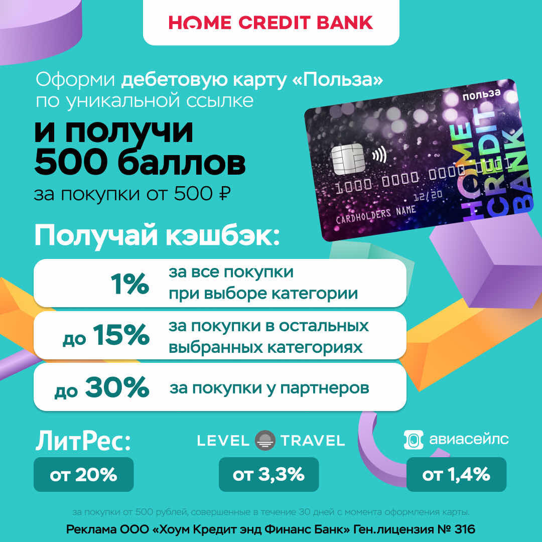 Оформи дебетовую карту «Польза» от Банка Хоум Кредит по уникальной ссылке https://getb.pl/QjOej и получи кэшбэк: 1. 500 баллов за покупки от 500 рублей, совершенные в течение 30 дней с момента оформления карты. 1 балл = 1 рубль. 2. 1% за любые покупки при выборе категории "1% за все покупки". 3. до 15% за покупки в остальных выбранных категориях. 4. до 30% за покупки у партнеров: — ЛитРес – от 20% — Level.Travel - от 3,3% — Aviasales - от 1,4% и другие.