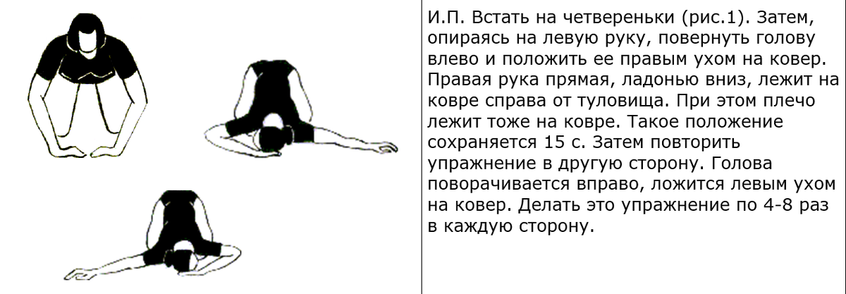 Комплекс № 2 «Для шейно-грудного отдела» Данный комплекс упражнений рекомендуется пациентам с болью в шее, головной болью, головокружениями, болями и тяжестью в плечевых суставах, воротниковой зоне, руках. Выполнять его необходимо также 2 раза в день, после комплекса № 1. Ноги на ширине плеч, носки в стороны. Ладони рук сомкнуты над головой в проекции макушки, локти разведены в стороны на 180 град. Сделать полуприсед с прямой спиной. Спина не должна смещаться вперед. Упражнение выполняется правильно, если во время выполнения в грудном отделе позвоночника (между лопатками) тянет (при смещении в грудном отделе происходит вправление диска или позвонка). Вернуться в исходное положение медленно. Выполнить 4 раза. Из исходного положения повернуть туловище влево, зафиксировать это положение 3-5 сек. Проделать по 2 поворота в каждую сторону. Дыхание носом поверхностное. Выполнять упражнение утром и вечером.