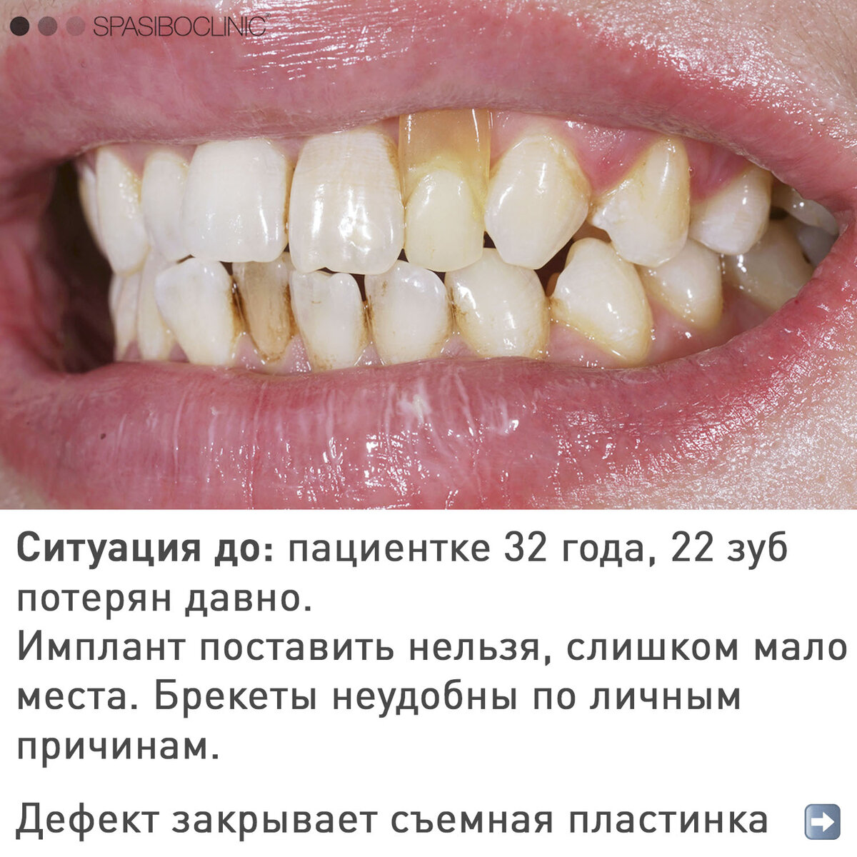 Восстановить десневые сосочки непросто и не всегда возможно! Но мы работаем в этом направлении🤓 🦷Пациентке 32 года, давно потеряна верхняя двойка (22 зуб). Для импланта нет места, нужно расширять место под него брекетами. Но по личным причинам поставить брекеты пациентка не может. Поэтому много лет она носила съемную пластинку, закрывающую дефект. Другого решения ей не предложили. Конечно, это неудобно, некрасиво, стесняет😐 🦷Нужно было восстановить 22 зуб, исходя из возможностей пациентки, и защитить десну от рецессии. Здесь нужен специальный профиль коронки, стимулирующий ее принять нужную форму и восстановить десневые сосочки. Такая пародонтологическая коронка — одна из разработок Алексея Фролова, она и стала решением.