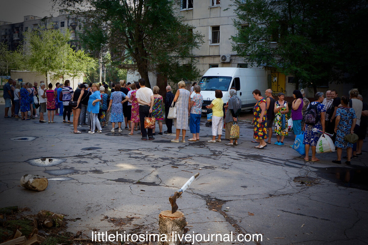 Поставил буса, взял в руки матюкальник (полезная для этих целей штука, орет громко - всем слышно). Прохожу сквозь квартал, который состоит практически из полутрупов-домов. Выбитые стекла - мелочи, целых окон нет вообще. Порушено этажами, подъездами, выгорело домами, обрушенные крыши. Даже с трудом сложно представить, что в этих остовах от домов живут люди. Хожу дом от дома, ору. Из ниоткуда появляются люди, что-то спрашивают. Механически отвечаю, сознание где-то далеко спряталось и отказывается понимать масштаб людских трагедий. Обойдя квартал по периметру, вернулся к бусу. А возле него выстроилась уже огромная очередь."