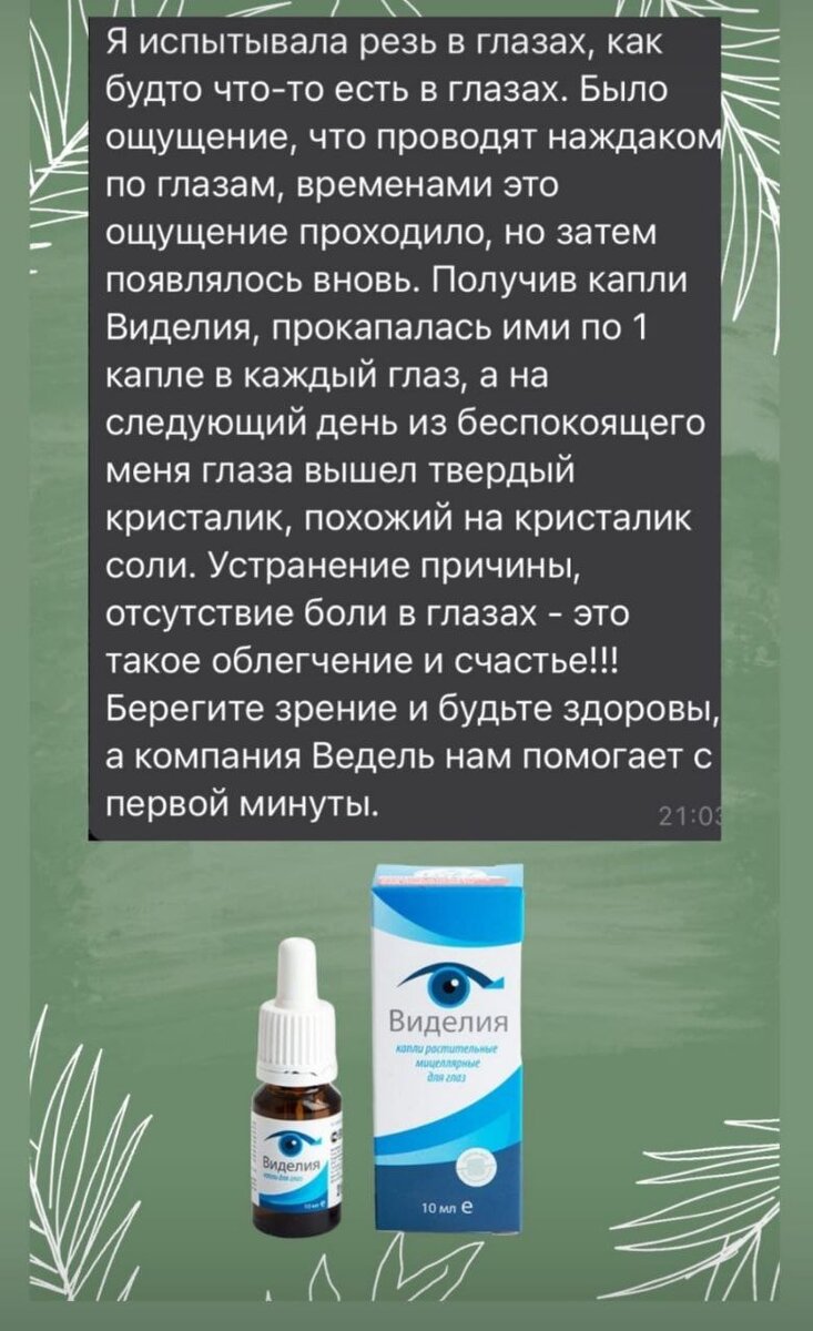 Каплями Виделия пользуюсь со дня основания Vedel, это просто спасение не только для глаз, очень хорошо по могают при отите, насморк е и не только детям. И ещё подсушивают герпесные высыпания. Вся наша продукция воздействует, на мой взгляд , на весь организм. И ещё отзыв о фитомасле Микодеколь. Приятельница засадила занозу в подушечку пальца так глубоко, что не смогла достать, и подумав, чем из нашей продукции можно помочь. Пропитали тампон маслом, токанье прекратилось сразу, наутро занозу не нашли. Чудо? Несомненно!!!!