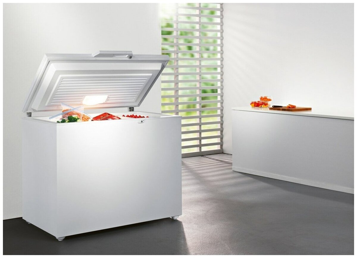 Настоящий гигант среди всех представленных в обзоре морозилок. Пожалуй, она даже ближе к профессиональным моделям. Максимальный объем камеры — 360 литров. Внутреннее пространство разбито на восемь отделений с прозрачными контейнерами. По отдельности можно хранить абсолютно все — от дежурных полуфабрикатов и мяса до летних заготовок и разных десертов. А еще тут предусмотрен специальный контейнер для льда, чтобы можно было всегда сделать прохладительные коктейли. Если дверца закрыта неплотно, сработает оповещение. Кроме того, у этой морозилки есть встроенная система самодиагностики. В случае неполадки она поможет выявить проблему. В дополнении ко всему у этой модели наиболее низкий уровень шума — до 38дБ.