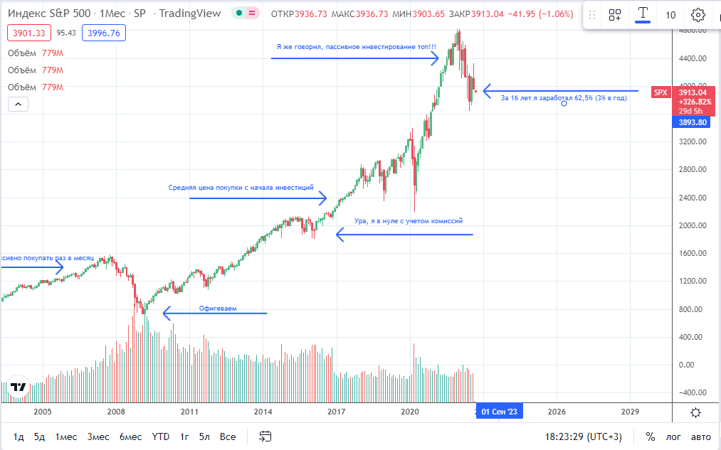 Идея этого подхода, конечно, звучит великолепно : вот вам фонд повторяющий индекс, вносите туда выбранное количество денег каждый месяц, получайте выгоду от сложных процентов и сформируйте себе пенсию через 20 лет. Другое дело, что это такая же сказка капитализма, как была идея коммунизма о построении социального равенства и благополучия. Если бы это работало, то благосостояние практически всех людей в капиталистически развитых странах на пенсии было бы выше среднего, на практике же картина совсем другая. На что настраивается человек, когда использует такой подход? На уход от риска. Он хочет гарантированно получить больше рискуя меньше. На деле, он рискует намного больше, чем просто покупая облигации, а зарабатывает намного меньше, чем при выборе правильных компаний. И не нужно говорить про статистические исследования и статьи в интернете, просто посмотрите, есть ли кто-то из ваших знакомых, кто так делает и узнайте результаты. За свои 10 лет опыта работе на финансовом рынке и взаимоде