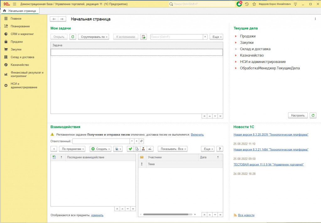 На главной странице конфигурации 1С:Управление торговлей размещен список задач и текущих дел, в левой части отображаются разделы программы. Список разделов формируется индивидуально для разных пользователей – настраивается системой распределения прав.