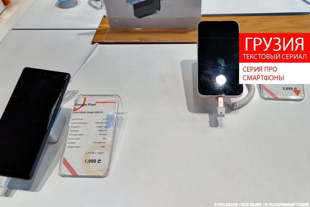 Кажется, сейчас только ленивый не задумывался о параллельном импорте товаров, и многие люди, выезжая за границу, имеют целью (в том числе и походить по магазинам, купить санкционные товары). Мне тоже сказали: "Едешь в Грузию – привези что-нибудь из электроники, по-любому там будет дешевле". И хотя мне ничего особенно в текущий момент времени не нужно, я зашёл в местный торговый центр, чтобы посмотреть цены и сравнить с нашими. Сам я пользуюсь смартфонами Самсунг уже давно, жена – фанат Эппл. Поэтому, чтобы не смущать персонал магазина и не фотографировать всю витрину, я снял парочку моделей каждого бренда, чтобы понимать порядок цен. Samsung Galaxy S21FE 6GB/128GB с двумя симками стоит 1800 грузинских лари. Samsung Galaxy S22 8GB/128GB с двумя симками – 2400 лари. Не стал искать цены в серых интернет магазинах, зашёл просто на сайт М.Видео. За те же модели у нас просят за "двадцать первый" – 50 000 т.р., за "двадцать второй" – 74 000 т. р. Официальноый курс лари к рублю – 1/20. То ест