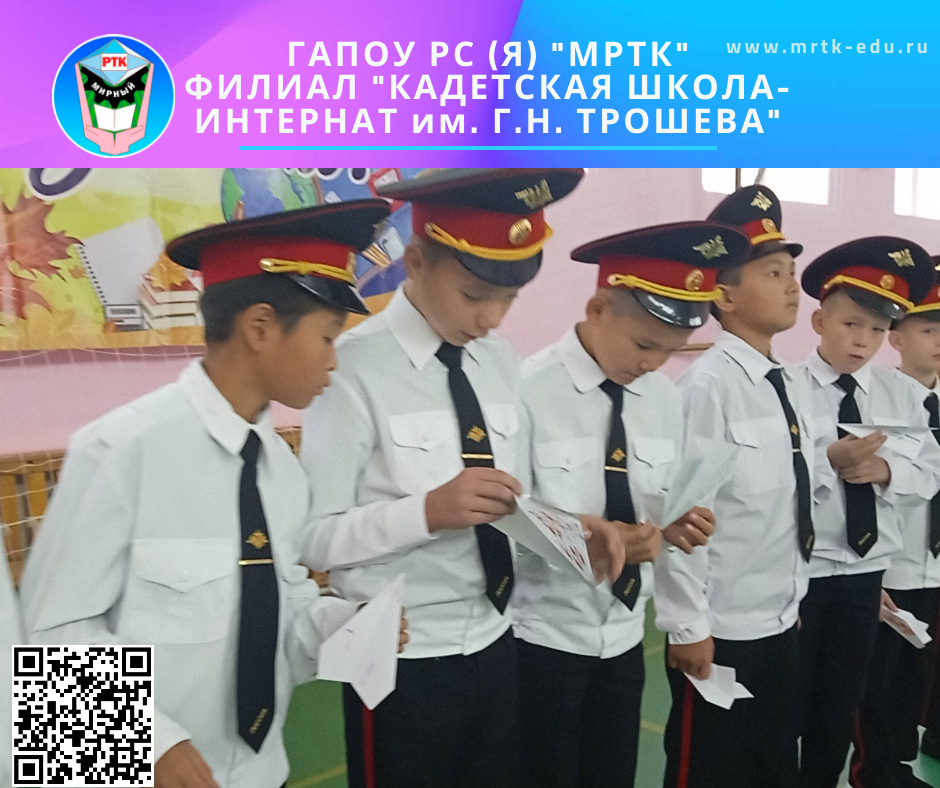 КШИ им. Г.Н. Трошева – участник Всероссийской акции «Самолетик будущего». 1 сентября 2022 г. ГАПОУ РС (Я) «МРТК» филиал «Кадетская школа-интернат им. Г.Н. Трошева» приняла участие во Всероссийской акции «Самолетик будущего», которая дала старт новому учебному году в рамках традиционных общешкольных линеек и Акции совместно с Российским движением школьников в формате дней единых действий. Обучающиеся 11 класса изготовили самолетики, написали напутственные слова для вновь прибывших шестиклассников. Новоиспеченные курсанты раскрыли самолетики и были очень рады всем пожеланиям. Самолетики с пожеланиями будут хранится в капсуле времени, и ребята всегда могут открыть ее и вновь вернуться к теплым и добрым напутствиям. Лариса Батлаева, педагог-организатор КШИ. Пресс-служба ГАПОУ РС (Я) «МРТК» филиал «Кадетская школа-интернат им. Г.Н. Трошева». #КадетскаяшколаинтернатимГНТрошева #КШИТрошева #кадеты #Чернышевский #МРТК #Мирнинскийколледж #Якутия #Мирнинскийрайон #всероссийскаяакция #самолети