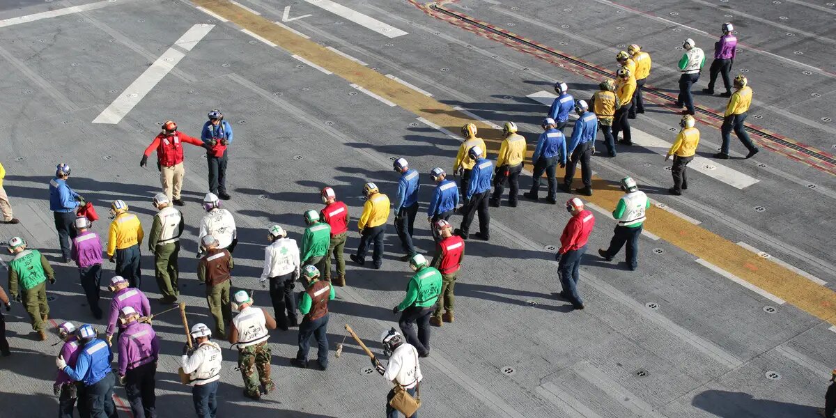 Поэтому должна быть четкая система, которая распределяет обязанности между членами экипажа находящимися непосредственно на палубе и в ангаре. Чтобы быстро понимать, кто и за что отвечает, все служащие облачены в разную по цвету спецодежду и шлемы.