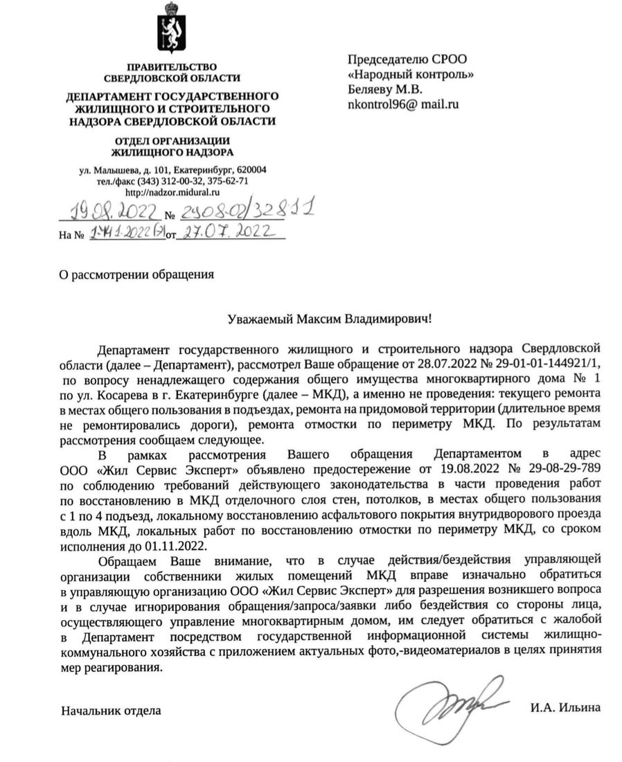 "В рамках рассмотрения Вашего обращения Департаментом в адрес ООО “Жил Сервис Эксперт” объявлено предостережение от 19.08.2022 №29-08-29-789 по соблюдению требований действующего законодательства в части проведения работ по восстановлению в МКД отбельного слоя стен, потолков, в местах общего пользования с 1 по 4 подъезд, локальному восстановлению асфальтового покрытия внутридворового проезда вдоль МКД, локальных работ по восстановлению отростки по периметру МКД, со сроком исполнения до 01.11.2022.