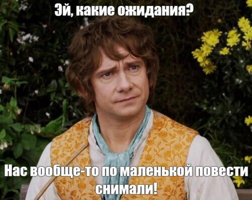 Нет, надо отметить что я с удовольствием посмотрел «Хоббита», но в этом то и суть, что это фильм «на один раз». Он не смотрится «живым» в отличие всё от того же ВК, где не было такого уровня спецэффектов и почти все пейзажи искались вручную, а не на зеленой тряпке, да и грим в ВК выигрывает у спецэффектов «Хоббита», разве что кроме варгов, но тут уж дело вкуса. Мир «Хоббита» немного «картонный», в отличие от органичного ВК, а вывод из этого можно сделать нестандартный, что главный грех «Хоббита», это не его грех, а фанатов Властелина колец, которые максимально его сравнивают, вот так вот.