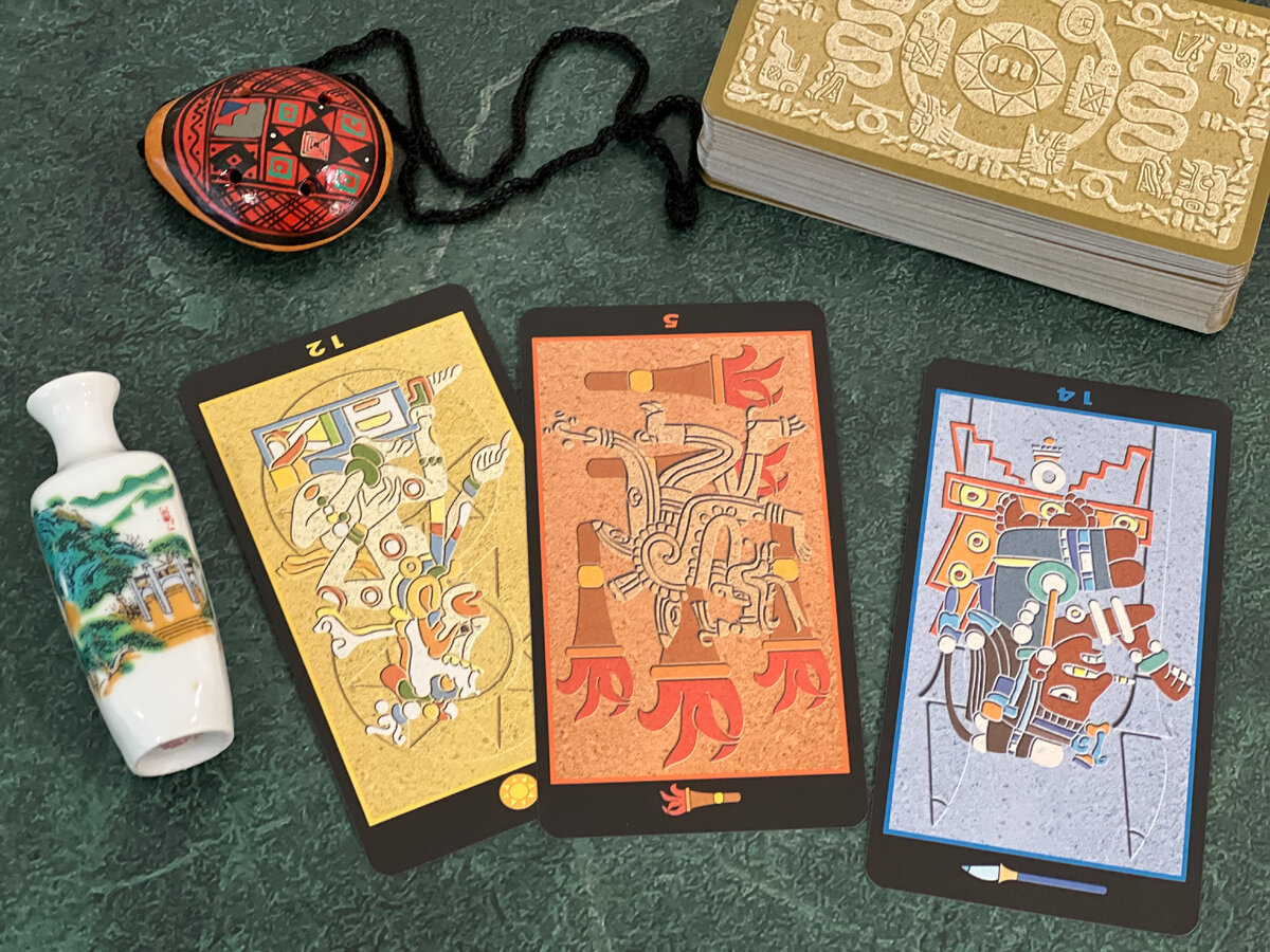 Предсказание на следующую неделю я выполнила на колоде таро Майя. Это удивительная колода, на создание которой, автора и художницу Сильвану Аласия вдохновила древняя цивилизация. Уникальность колоды заключается не только в том, что у нее очень необычный символизм, навеянный духом загадочных Майя. Карты напоминают наскальный рисунки, наполненные древними мистическими символами. Но еще у них своеобразная нумерация. Карты двора не подписаны, как у обычных классических колод, а тоже пронумерованы. Пажи соответствуют цифре 11, а короли - 14. Несколько иначе называются и масти: Мечи — Копья; Жезлы — Факелы; Чаши — Терракотовая посуда; Пентакли — Солнце. Глядя на карты таро Майя особенно чувствуется связь между людьми и силами природы, стихиями и временем.