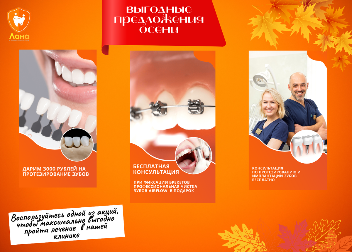 Наступила осень и мы поздравляем всех родителей и детей с началом нового учебного года! Для Вас мы подготовили в осеннем сезоне новые интересные предложения на лечение в нашей клинике. ДАРИМ 3000 РУБЛЕЙ НА ПРОТЕЗИРОВАНИЕ ЗУБОВ