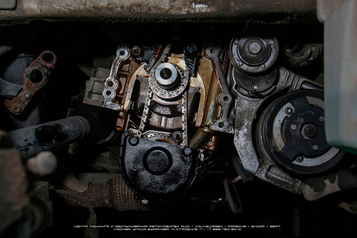 По результатам осмотра было выявлено - необходимо менять комплект цепи ГРМ [ Растянутую цепь можно услышать по характерному треску, особенно в момент холодного запуска мотора. Так же, существует процедура проверки растяжения цепи - фаз газораспределения при помощи специального оригинального приспособления ] После того, как мы убедились в необходимости замены и получили все детали на складе – можно приступать к снятию старой цепи