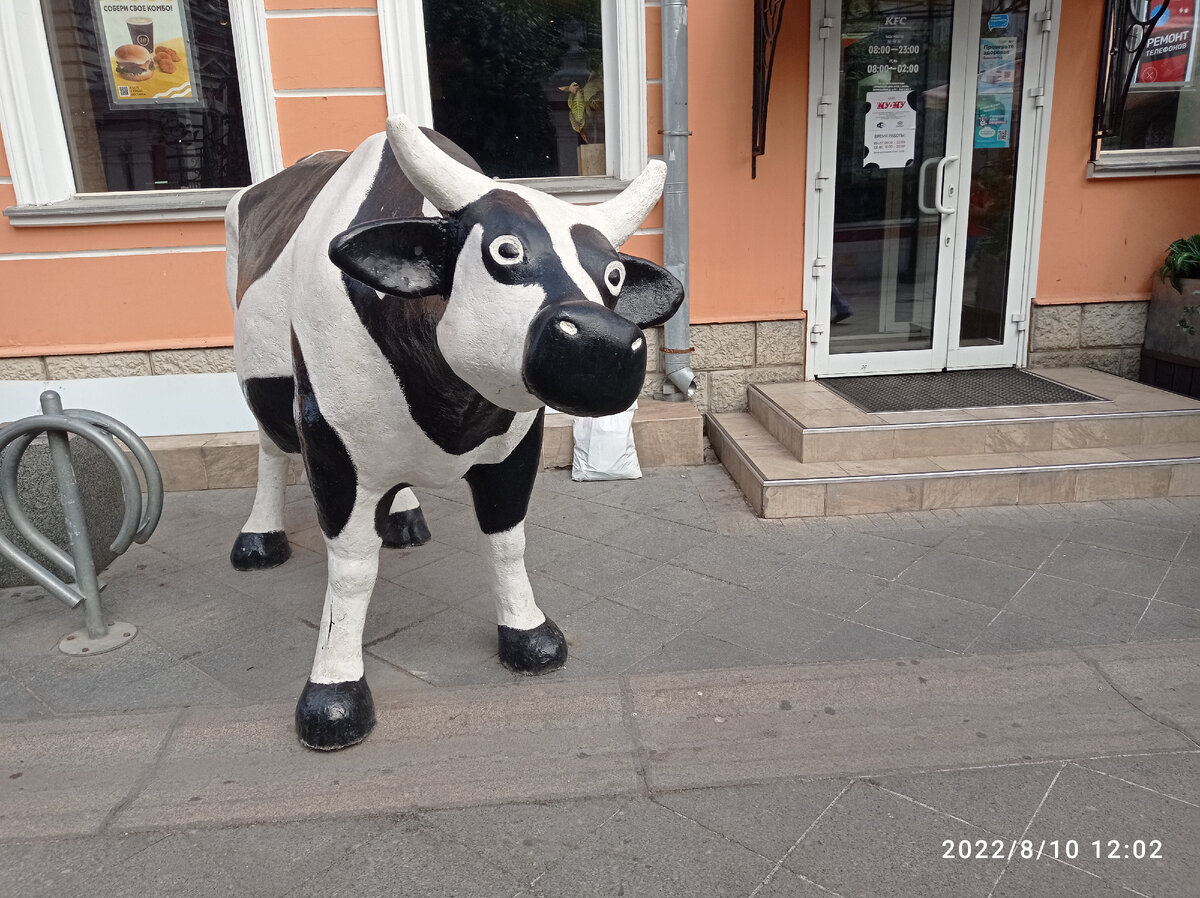 10 августа 2022 года шла от трамвая до станции метро Третьяковская. И возле сетевого кафе стояла Корова. Она смотрела на проходящих людей и как будто говорила: "Всё идёте куда-то и идёте. А остановиться и посмотреть вокруг" .