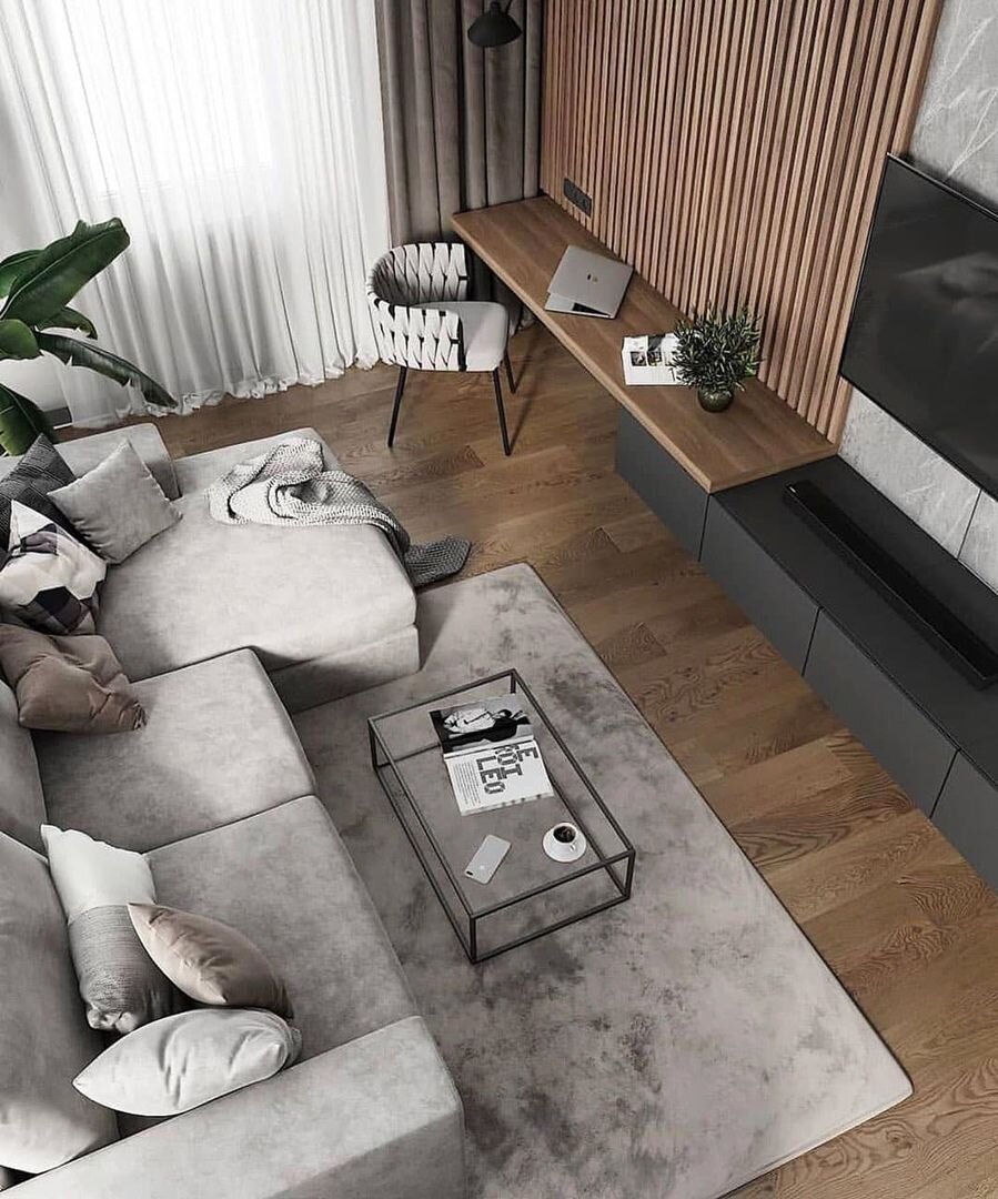 В современных реалиях многие люди предпочитают удаленную работу и трудятся дома. Но даже большие квартиры не всегда позволяют выделить отдельное помещение под кабинет. В этом случае рабочую зону обустраивают в гостиной, так как это обычно довольно просторная комната, где проще всего выделить место под стол. Как это сделать, чтобы не потерять внешний вид комнаты, чтобы сочетание разных по функционалу зон выглядело уместно и красиво, рассмотрим в этой статье. В первую очередь нужно определить, сколько места займет рабочая зона исходя из особенностей процесса. Если вы работаете пару часов в день и для этого вам необходим только телефон или ноутбук, то для занятий можно выделать небольшой стол шириной 50-60 сантиметров, подойдет даже подоконник. Для комфортной работы за компьютером, чтобы разместить системный блок, монитор и все принадлежности, достаточно будет столешницы около 70 сантиметров. Если техники и принадлежностей много, или есть необходимость для работы нескольких человек, то т