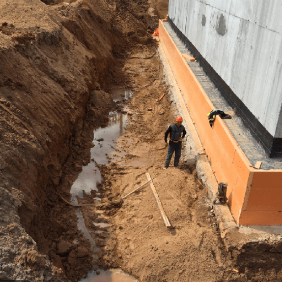 Гидроизоляция наносится на вертикальные поверхности фундамента вместе с утепляющим слоем. В процессе работ по заполнению пазух можно легко пробить покрытие оборудованием или лопатой. В этом случае герметичность контура будет нарушена.