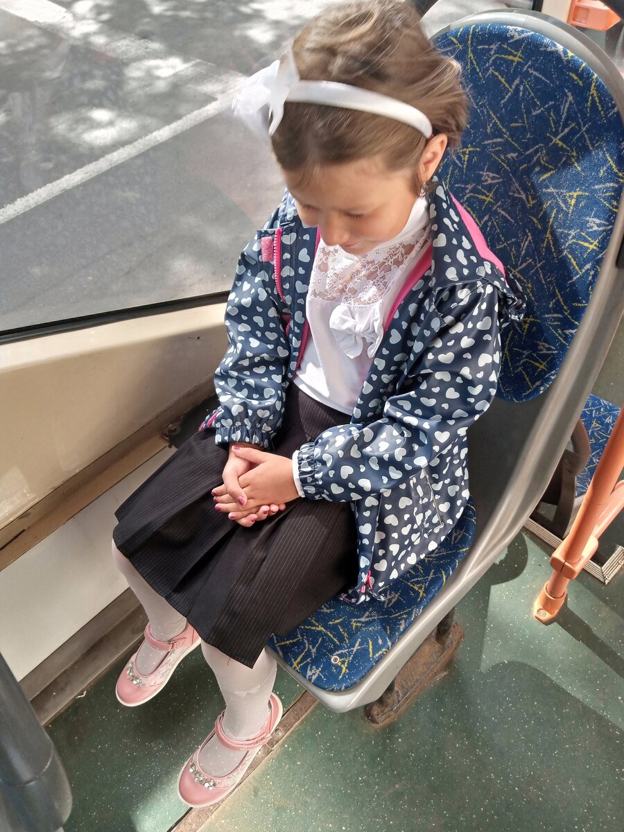 Точно не мне. Именно этого начАла учгода я ждала с невиданным доселе ужасом. Двое своих школьниц, еще минимум 17 почти своих, и за все их знания ты отвечаешь перед обществом головой) Еще надо куда-то впихнуть кружки и спорты, а спорты переехали далеко от дома... Короче, неудивительно, что Асе передался мой немереный энтузиазм, и на свою первую в жизни линейку она ехала вот так. Но наша школа затем и самая "непрестижная" школа района (в округе сплошные лицеи и гимназии), чтобы на фоне прочих отличаться отличным педсоставом, администрацией и недобранными классами). Что меня, как человека с некоторым чутьем на учебные заведения и других педагогов, полностью устраивает. После линейки я подошла к завучу по воспиталке и выразила ей респект и восхищение за проделанную работу - настолько мило, неформально и душевно прошел этот сбор. Да, организация местами страдала - учителя и завучи слегка путали лево и право и некоторое время гоняли малышей с места на место) Да, часть ребят из старш