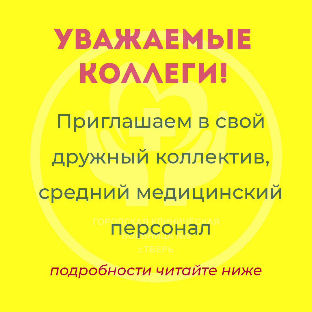 Уважаемые коллеги! ГБУЗ "ГКБ 6" приглашает вас в свой дружный коллектив на должность среднего медицинского персонала. Мы предлагаем: полный социальный пакет, ежегодный медицинский осмотр, комфортное рабочее место, ежегодный оплачиваемый отпуск (42 календарных дня). Гибкий график работы, возможность совместительства и дополнительных смен. Заработная плата 20000 на руки, на 1 ставку! Ждём вас по адресу г. Тверь, ул. Орджоникидзе д. 36. Контактный телефон отдела кадров 8 (4822) 58-15-10, Любовь Николаевна.