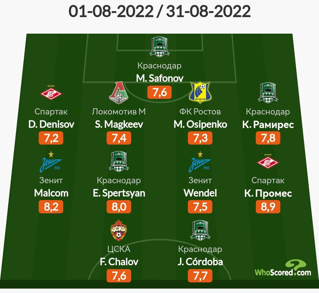 Всем привет! Статистическая платформа WhoScored опубликовала символическую сборную игроков РПЛ по итогам августа 2022 года. Квинси Промес стал лучшим игроком месяца со средней оценкой 8,9. Также в число одиннадцати лучших вошёл защитник красно-белых Даниил Денисов, чей средний балл составил 7,2. Вот кто бы в начале августа мог подумать, что Денисов будет представлять красно-белых в сборной РПЛ за месяц? Я вот точно нет, его присутствие в составе мне казалось нелогичным и скорее вынужденным. Но, доверие тренера и талант Даниила и вот, он уже лучший игрок месяца в чемпионате на своей позиции. Правда, не стоит сильно обольщаться, 7,2 - это довольно низкий балл и с таким в символическую сборную попадают не часто. Что ж, признаю свою неправоту относительно нашего молодого защитника и желаю ему прогрессировать и дальше, что бы в сентябре попасть в эту сборную с рейтингом повыше. Ну и Квинси - красавчик, надеюсь не сбавит оборотов и в этом сезоне подвинет в списке бомбардиров легенду - Анд